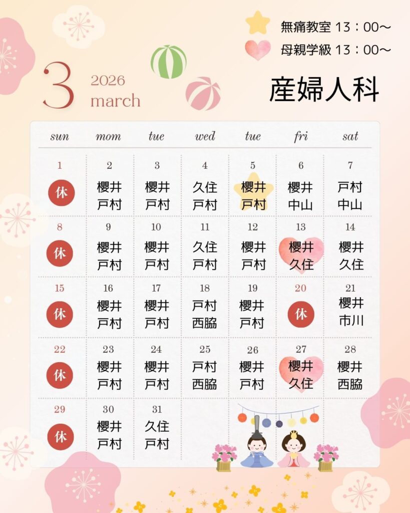 母親教室は妊娠30週以降からご自身で予約を取ることができます。 来院の際は、こんにちは赤ちゃんの冊子・母子手帳を忘れずにご持参ください。 また、ご主人やお付き添いの方はご遠慮いただいております。